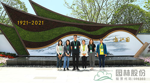 浙江园深化设计负责人高博、花境施工负责人张楠等在浙江园入口合影