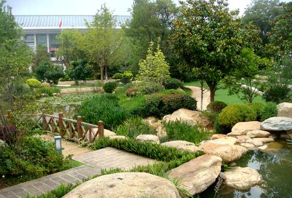 自然式驳岸让人工湖更具野趣,大小不一的天然景石成组摆放。从岸边到水中,陆地植物、湿地植物、水生植物依次“排列”,以最淳朴的方式演绎着自然规律。水边大量栽种柳树,轻柔的枝条随风摇摆,旁边搭配清香木、鸡爪槭等耐水湿乔、灌木,丰富的叶色、优美的姿态将普通的湖岸装饰一新。对于湖面较大的部分,仅在湖体四周以块状方式种植水生植物或湿生植物,中央区域则不种植水生植物,以扩大空间感,使得树木、建筑物能够形成完整的倒影,成就优美的“水中画”。