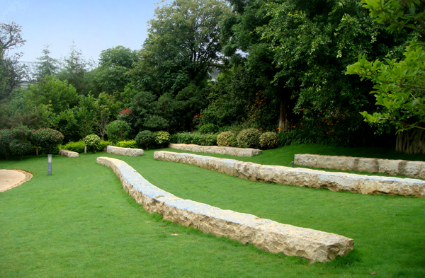 自然面花岗岩条石布置在草坪上,营造极具现代气息的景致。