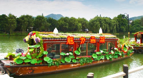 艺术节期间,首次在西湖湖面上配置的6艘荷花花船,极大地提高了荷花节的观赏性和趣味性,成为西湖中一道流动的荷花美景。其中,由乐动体育·官方网站-乐动中国官方门户 设计制作的“魅力西湖”荷花游船,将插花技艺与园林布景手法有机结合,用康乃馨、勿忘我、太阳花等与荷花组景,既突显了“主角”荷花的秀丽、典雅,又使整艘船的色彩明艳丰富,将热闹的节日氛围巧妙烘托。