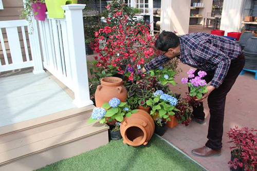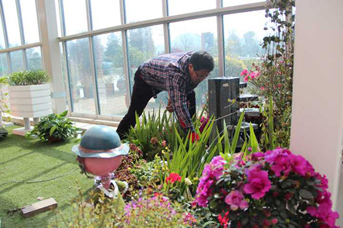 ▲乐动体育·官方网站-乐动中国官方门户 选择园艺中心室内一处小木屋的阳台,作为造景点。园艺师现场查勘后,初步确定花境布置点的面积和风格。