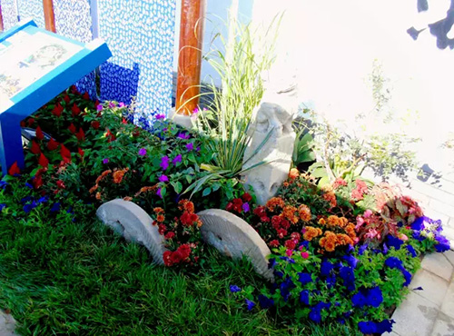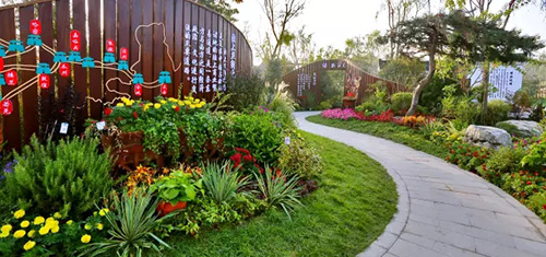 考虑到银川的干燥气候,垂直绿化墙植物的保湿成为难题。“浙江园”垂直绿化墙以无纺布为墙体材料,使用保湿性强的基质,优选植物种类,同时搭配滴灌系统,保证了绿化墙鲜花拥簇的景象。展园内的垂直绿化墙设计简洁、曲线优美,与以钱塘江文化为主题的背景墙相互映衬,共同展现了新时期浙江园林景观的不断发展与创新。