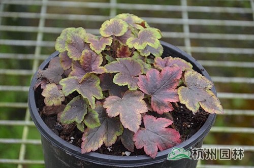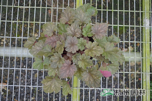 矾根叶形也变化多样,基部心形或楔形,掌状浅裂至深裂,边缘波状,浅根系,叶基生,花期一般为4~10月,花很小,呈钟状,两边对称。幼苗长势缓慢,成苗后生长旺盛。绿期长,能够在-15℃以上的温度下生长。具有喜半荫、耐全光、耐旱性和耐寒性强等生理特点。适宜富含腐殖质的土壤。喜中性偏酸,适宜的PH值为5.8~6.2,能够在倾斜地方生长。冬季不落叶,枝叶生长稠密,株型圆整,覆盖性强,花和叶都比较漂亮。