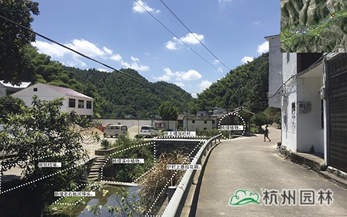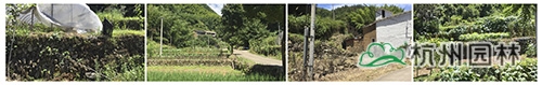 村庄整体绿化以山体绿化、田地种植为主。村庄主干道绿化情况不理想,主要为蔬菜种植和一年生草本花卉种植。村民庭院空间、宅前屋后绿量不足,影响村庄整体的绿化景观风貌。道路边上的袅溪水质优良,现状平台较为破旧,有些水潭节点缺少平台。