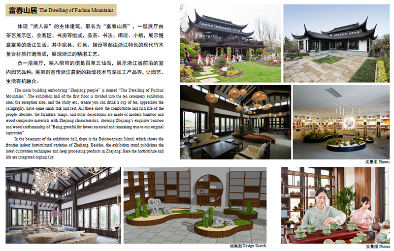 浙江园内体现“浙人家”的主体建筑取名为“富春山居”,该建筑以浙派民居为原型,飞檐翘角,格局大气,尽显浙江风情。深化这个建筑单体,团队做了很多功课,花了许多心思,考察了许多浙江特色民居,在充分运用现代建筑材料与结构的基础上,通过对浙江传统民居建筑的经典片段提取和抽象提炼,赋予这些元素和符号以新的意义,构建出浙江传统民居的新风貌。它不是对传统民居建筑的照抄照搬,而是继承和创新,设计了一栋独一无二的建筑。