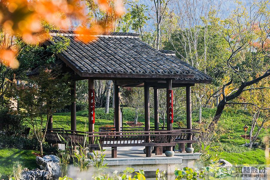 契合展区主题的樾香亭临湖而立,双坡屋面,八柱敞亭,柱子上书五言联“鱼乐人亦乐,泉清心共清”,尽显悠闲舒适的情趣。在亭内凭栏而坐,侧耳听风雨,迎风嗅花香。抬头远望,荷叶亭亭的水面上,有鱼儿在水中嬉戏;曲折的长桥上,游人在漫步观景;水岸边,银杏、三角枫、乌桕等色彩缤纷,编织出一幅深秋的美丽画卷。