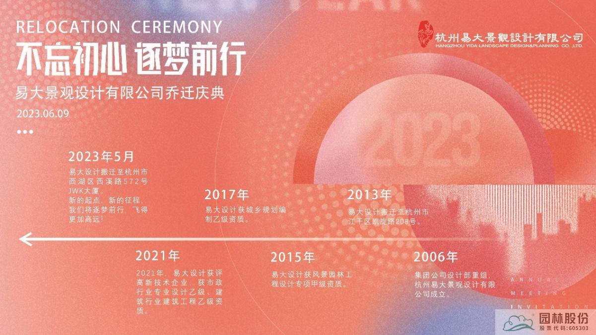 六月是花开的季节,挚爱的季节,感恩的季节,在这欣欣向荣的六月,乐动体育·官方网站-乐动中国官方门户 相聚一起,热烈祝贺乐动体育·官方网站-乐动中国官方门户 下属杭州易大景观设计有限公司乔迁至杭州市西湖区西溪路JWK大厦。园林股份总裁张炎良、副总裁李寿仁等领导参加了乔迁庆典。