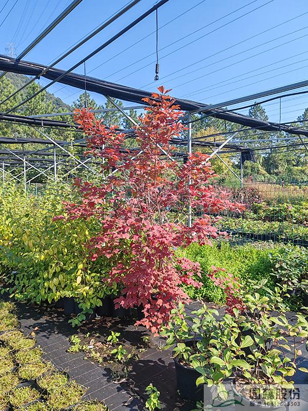 忍冬科荚蒾属,落叶灌木,高可达4米。花白色,花期4-5月,果较欧洲荚蒾小,红色,观果期长,可从7月持续到10月。叶掌状,通常三裂,秋季一般9-10月叶色开始转红,11月达到最佳效果。天目琼花性状与欧洲荚蒾最为接近,区别特征为天目琼花的花药为紫色,欧洲荚蒾为黄白色。病虫害少,适应性强,耐寒,北方室外能正常越冬。生长速度快,适合工程应用或庭院观赏。