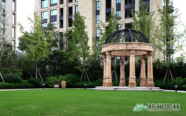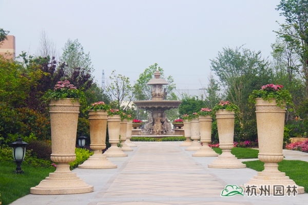该工程位于杭州城北石祥路与蔡马河交汇处,为大型综合性园林景观工程,内容包括园林建筑、苗木种植、硬质铺装、叠石跌水、景观小品、土坡造型等。该项目景观全方位采用规则式与自然式融合的维多利亚园林风格,如梦似幻,华贵雍容,将维多利亚皇家园林景观特征表现得淋漓尽致。