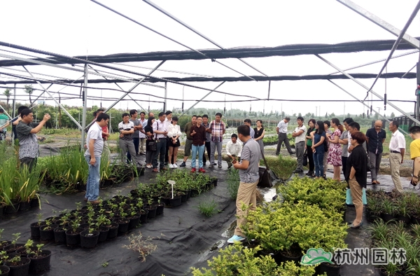 研发中心技术员刘华红带领大家来到画境径山生产中心进行实地参观。结合研发中心开展的一个除草剂试验,刘华红向大家介绍了试验的设计思路、处理设置,展示了拔绿(Barricade)、莠去津(Atrazine)等4种除草剂不同浓度处理的除草效果,初步指出正常用量的拔绿对多种庭院植物容器苗的除草效果较好。