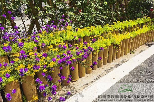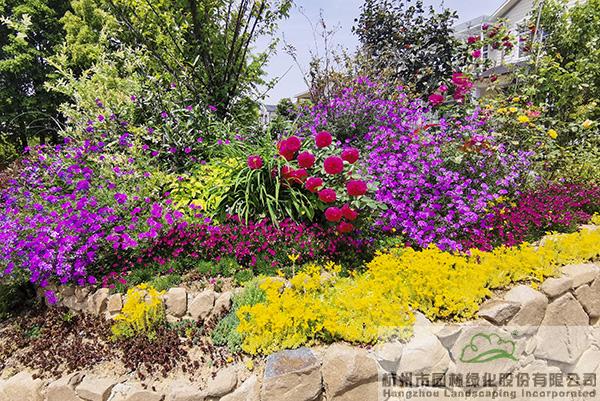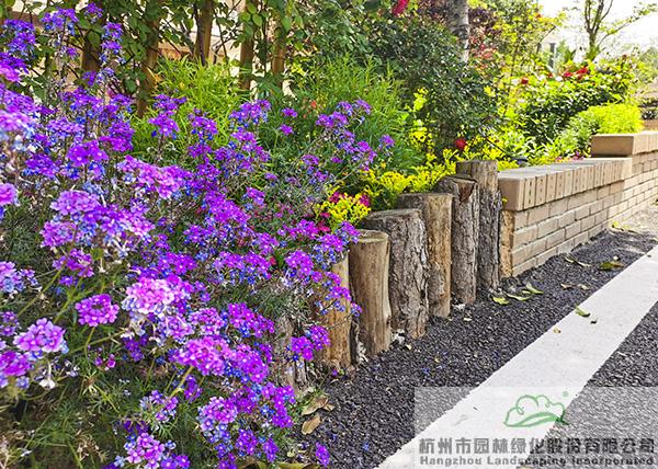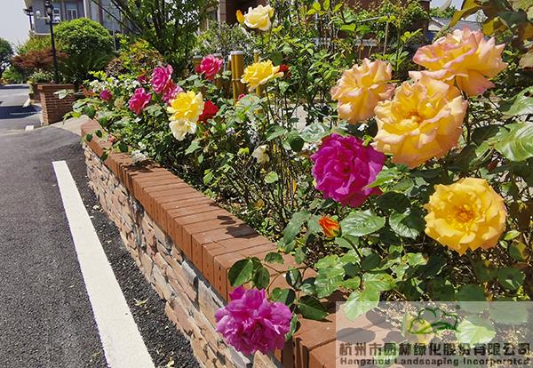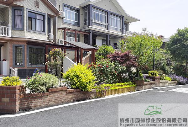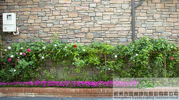 景墙边的植物配置同样有讲究。利用银杏、桂花、梅花、红枫等植物营造上层空间,这些植物具有遮挡作用,能够为庭院营造一定的私密空间。通过树状、球状、攀援、伞状、字母等各种形态的月季,金冠女贞球、龟甲冬青球、银姬小蜡球、蓝莓、八仙花、小叶栀子、翠芦莉、花叶千鸟花、蓝山鼠尾草、紫叶狼尾草等小乔灌木,在打造中层空间的同时,和美女樱、金娃娃萱草、花叶玉蝉花、花叶香桃木、紫菀、泽兰、矾根、五彩络石、石竹等下层空间植物一起,装饰和衬托景墙,使家家户户的景观更加丰富多变。