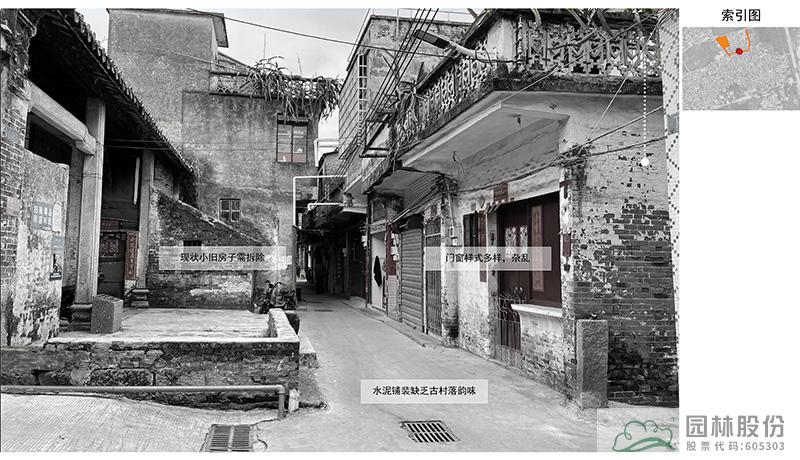 巷道改造现状:现状巷道为水泥路铺装,沿路缺少绿化,墙面砖砌样式多样,不统一,景观效果不佳。