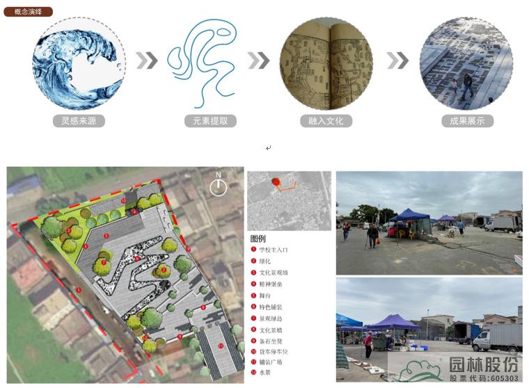 入口休闲广场概念演绎设计说明:现状场地主要为一片空地,由于南面是菜场,因此该场地在功能性上主要有货车卸货的功能,考虑村庄内可能举办大型祭祀活动或者红白喜事,需要有大空间,所以在设计中留出了大片场地。因沿海城市,所以提取了海浪元素,结合当地历史文化及村落肌理,做出如图设计。