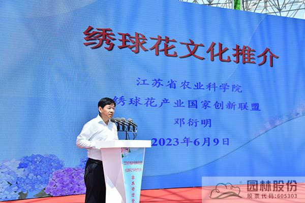 江苏省农科院休闲农业研究所副所长、绣球花产业国家创新联盟专家委员会副主任邓衍明作中国绣球花文化推介,着重讲述了绣球花的文化起源,“始于唐,兴于宋,流行于明清,盛行于当下”,并建议沭阳要充分发挥自身的地理气候优势和电商产业优势,大力发展绣球盆花和花文化产业,助力沭阳花卉产业的高质量发展。