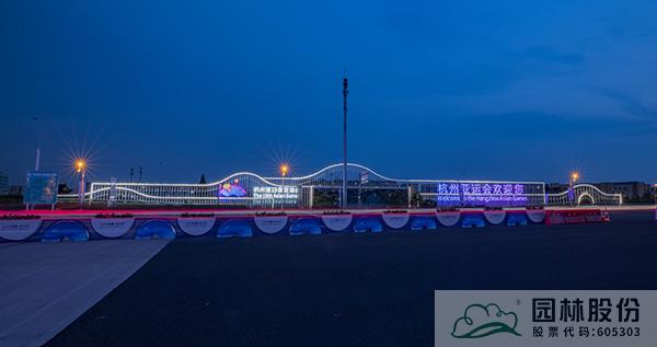 在北侧迎宾区打造绿化景观,杭州园林股份以匠心雕琢,以细节致胜,通过微地形处置,营造开合有致的多变空间,植物配置以银杏、黄山栾树、丹桂等色叶树种为背景基调,搭配长效花境组团,营造线条流畅大气、四季风景各异的景观风貌。后期,又加入了亚运会吉祥物、道旗装饰等,为花满杭城的亚运氛围增色添彩。